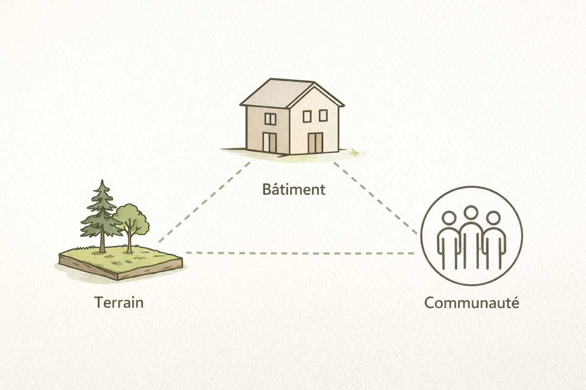 Dans une logique classique, le terrain et le bâtiment suivent la même logique de propriété et de valeur. Dans une FFC, ce n’est pas nécessairement le cas. Le terrain peut être détenu par la structure communautaire, pendant que le bâtiment ou l’usage du bâtiment est confié à d’autres acteurs selon le montage retenu.